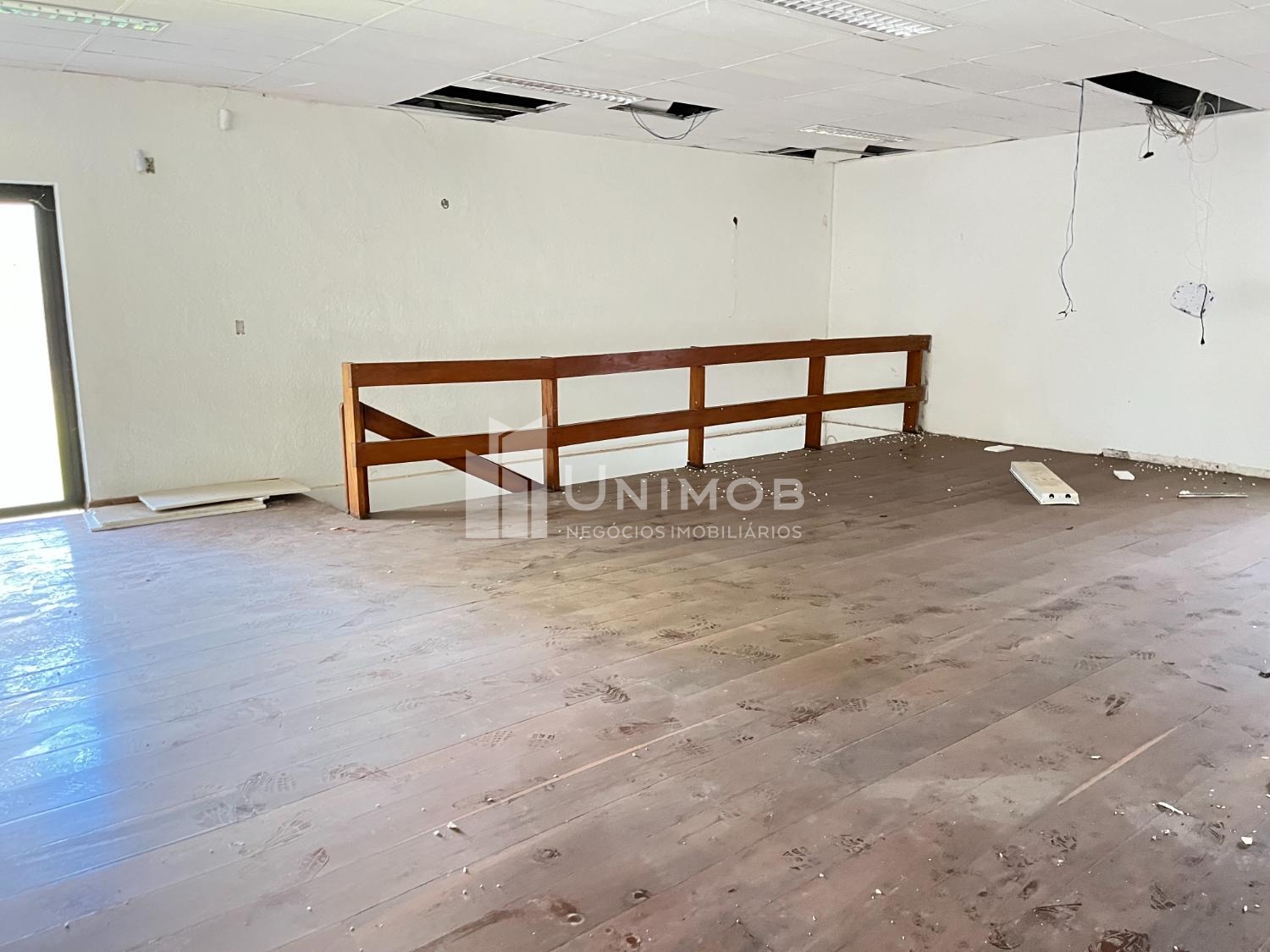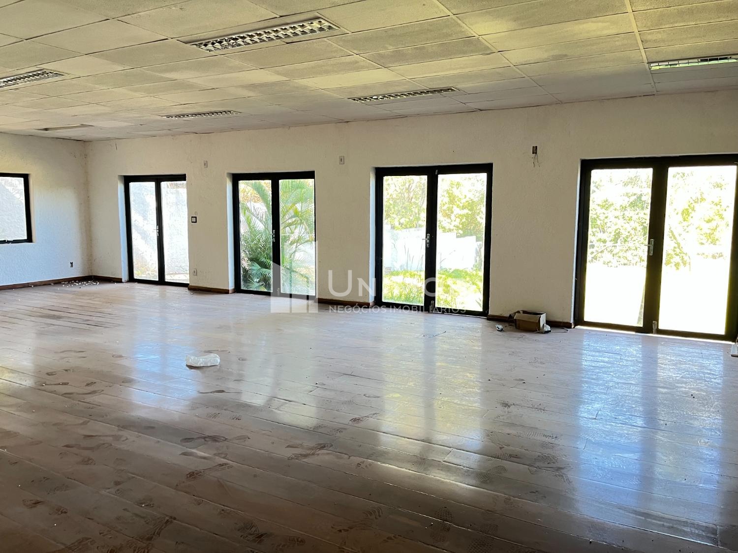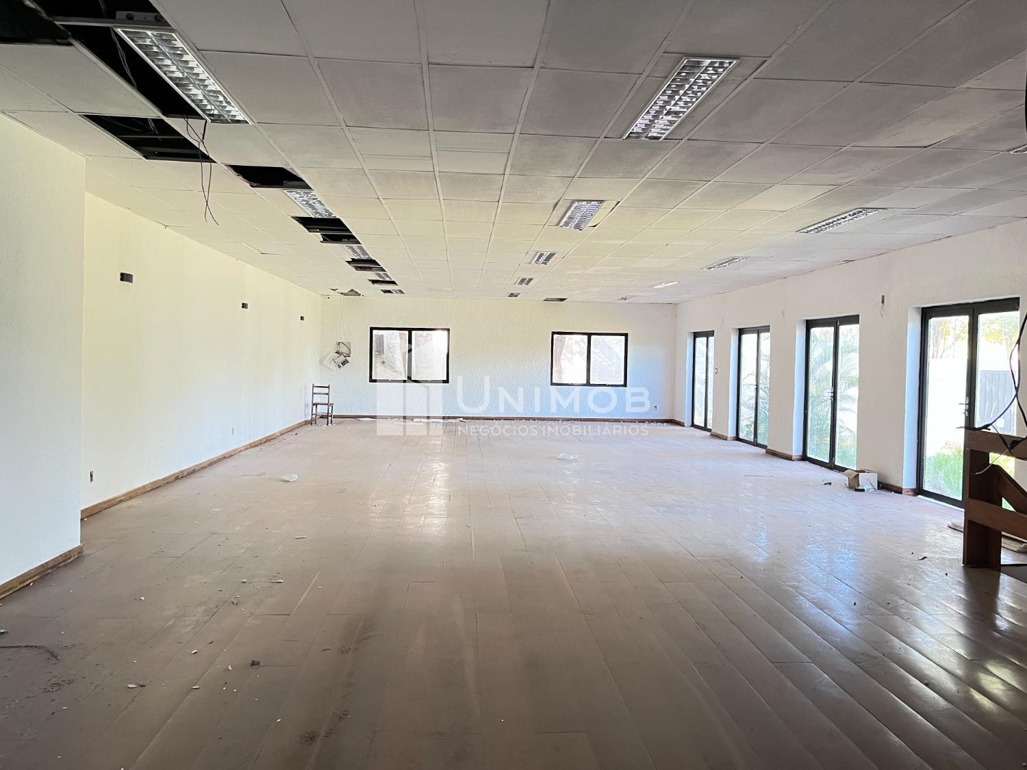 Piso superior: amplo salão com piso de madeira e janelas de vidro e uma sala de apoio