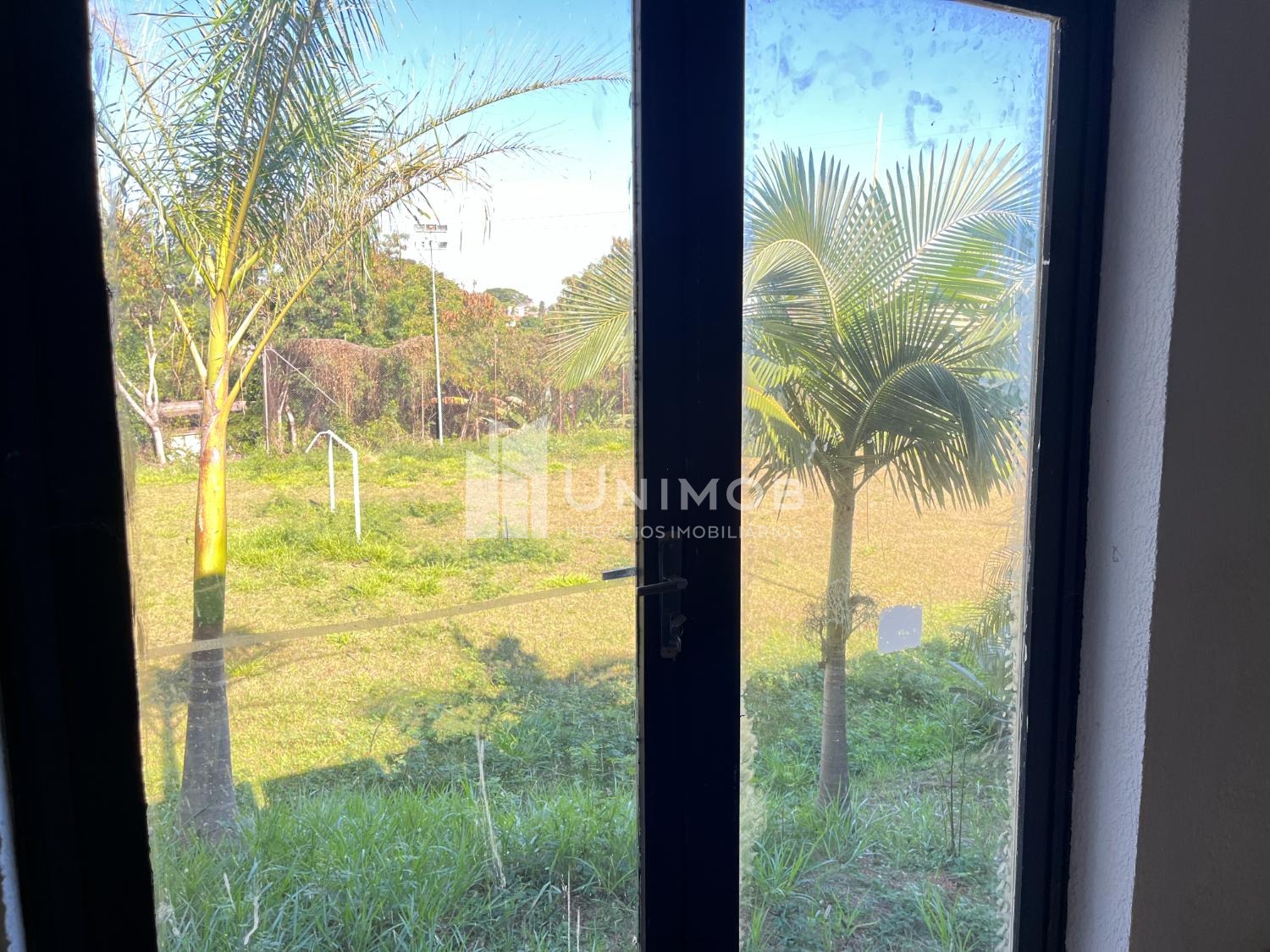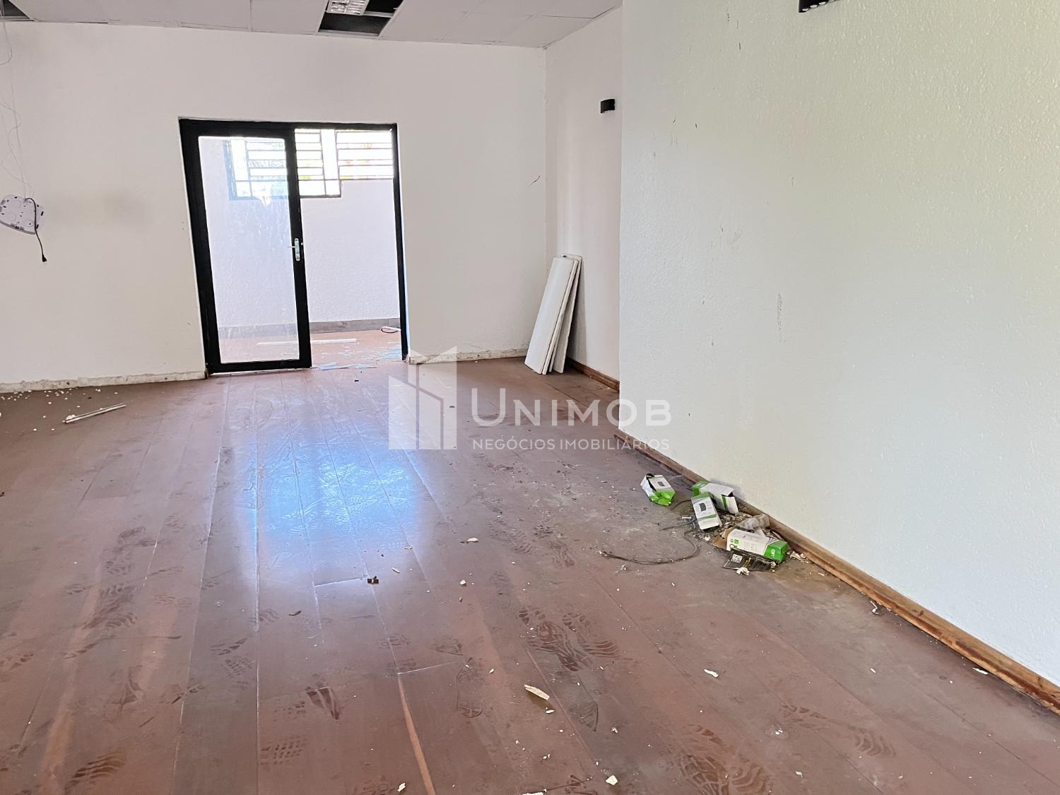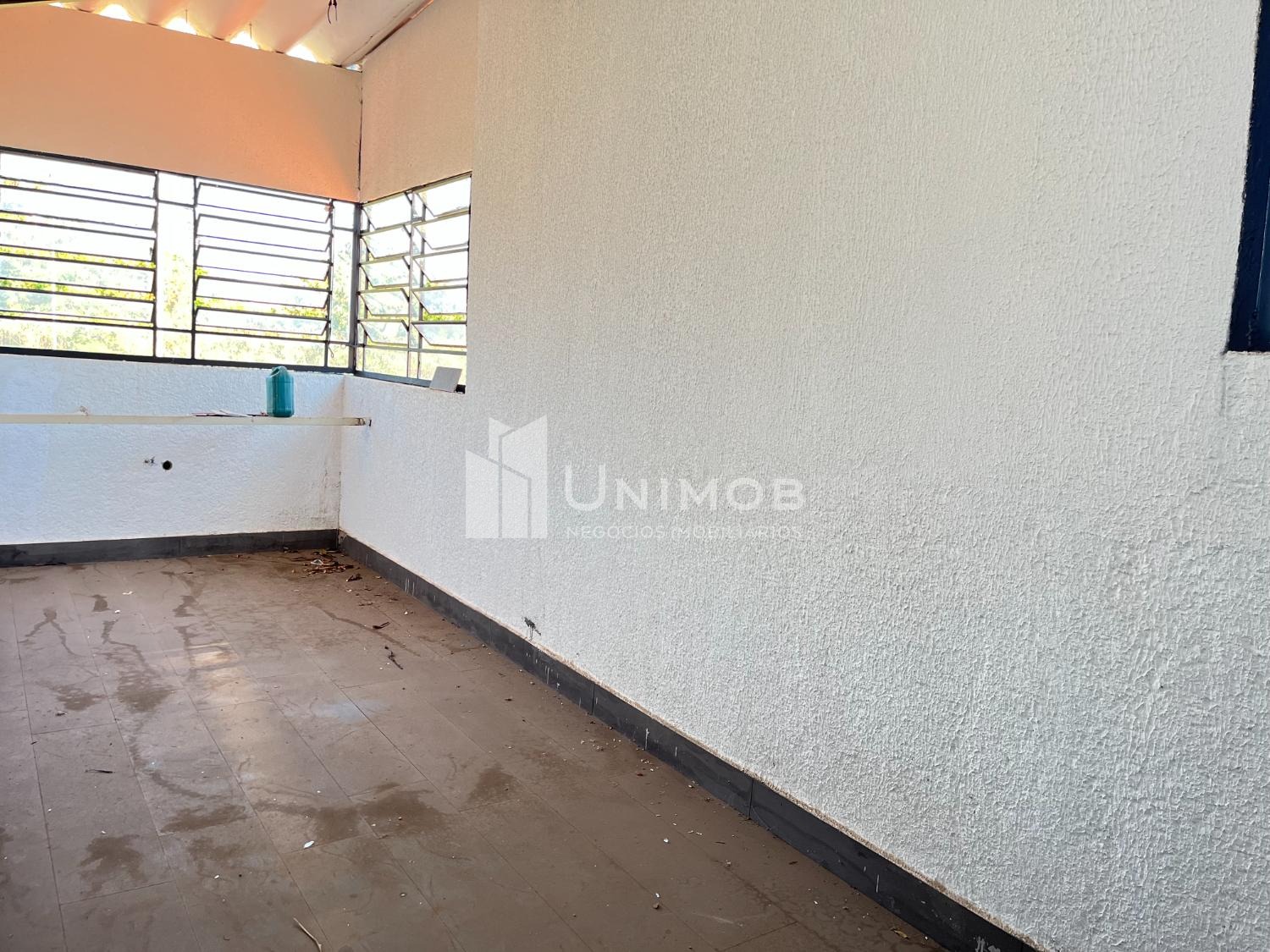Piso superior: amplo salão com piso de madeira e janelas de vidro e uma sala de apoio
