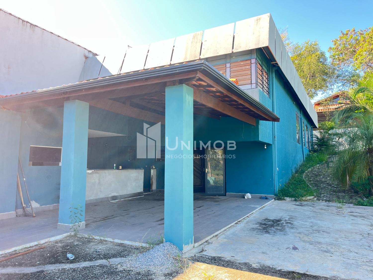Entrada principal com portão deslizante 4x5m, há uma construção de 318,20m2 do lado direito , em 2 pisos: